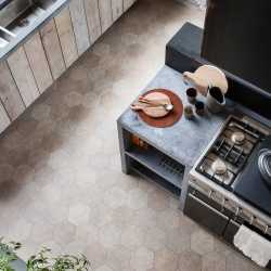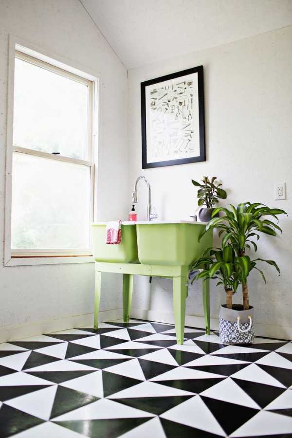 Отличное решение — применение в современном кухонном пространстве однотонный красочный с рельефной структурой линолеум. Одно из традиционных решений — покрытие под керамику, однако подойдут и ПВХ плитки.