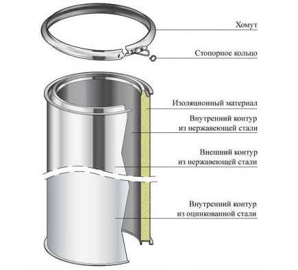 Устройство такого дымохода представляет собой стальную трубу, в которой закреплена другая труба, диаметром меньше на 20-60 мм, а между ними расположен слой теплоизоляции из базальтовой ваты.