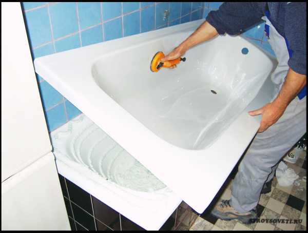 После того как акриловый вкладыш в ванну хорошо вошел и расправился, устанавливают сифон с переливом. Элементы прижмут края вкладыша вокруг отверстий. Борта чаши по периметру сжимают струбцинами. Закрыв заглушкой слив, в чашу набирают воду на 30 мм ниже перелива, и оставляют вкладыш под водяным грузом на сутки пока застынет герметик с пеной. На следующий день воду можно слить, новую чашу установить на свое постоянное место, а бока закрыть декоративным экраном.
