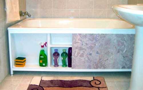 Конструкция экрана, собираемого своими руками, в первую очередь зависит от типа установки акриловой ванны. Как известно, ванну из акрила можно установить на специальные ножки. Однако такой опоры ей не всегда бывает достаточно. Поэтому нередко в качестве дополнительной опоры собирают кирпичную кладку. Это, в свою очередь, означает, что для химических средств, и принадлежностей для ванны останется значительно меньше места.
