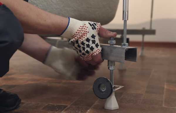 - Выровняв еще раз изделие вертикально по уровню, приступают к регулировке высоты ножек. После того как каждая из них упрется в пол, он прочно установится под ванной.