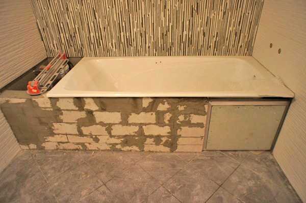 Во многих случаях для скрытия пространства под ванной, применяют простую кладку из кирпича, после чего на нее кладут кафельную плитку, в точности такую, какой отделана ванная комната. Также часто для облицовки этого участка ванной используются зеркала, с помощью которых комната визуально увеличивается в размерах, особенно в тех случаях, когда помещение имеет крохотные размеры.