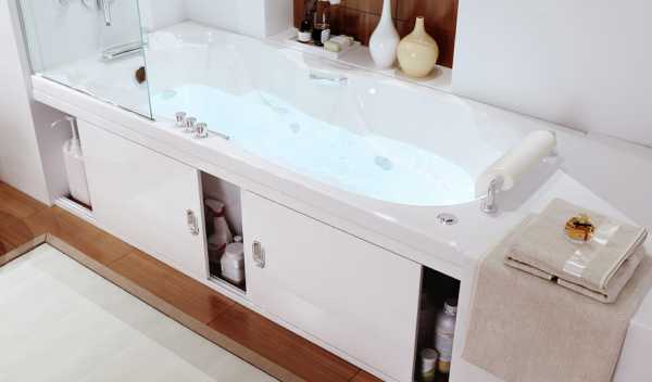 Нужно заметить, что установка экрана на ванну с простой конструкцией гораздо проще, нежели той в которой имеются дверцы, но в первом случае вы не сможете воспользоваться пространством под ванной и применить свободное место для сохранения всевозможных предметов.