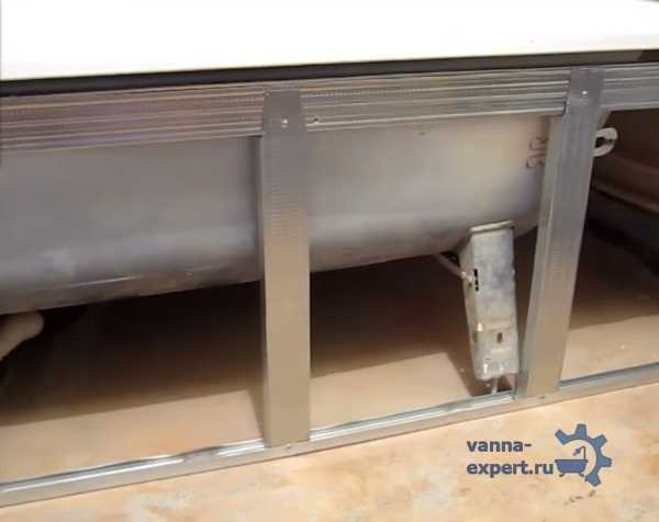В том случае, если вы планируете создавать экран не из кирпича, а из менее капитальных материалов, вам обязательно понадобиться металлический, каркас. В любой другой комнате каркас можно было бы сделать из дерева, но для ванной этот материал категорически не подходит. Каркас экрана монтируется под акриловую ванну в следующем порядке: