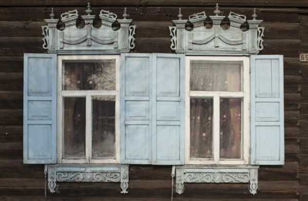 Прорезные наличники на окнах деревянного дома в Иркутске