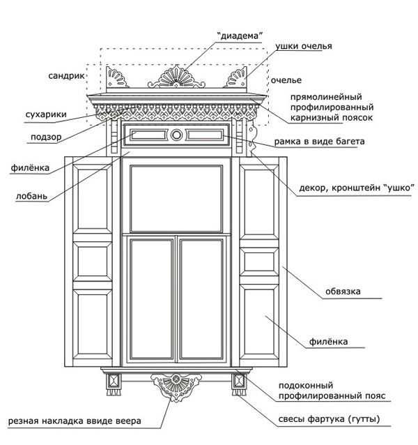 Схема резного наличника со ставнями для традиционного деревянного дома
