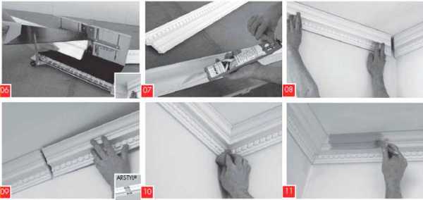 Монтаж полиуретанового потолочного плинтуса можно разделить на несколько этапов: