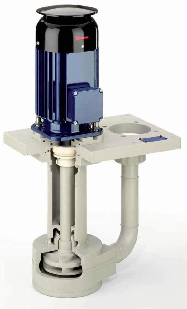 Насосное оборудование полупогружного типа состоит из электродвигателя, устанавливаемого в сухом месте, и рабочей камеры, погружаемой в стоки. В единое целое они соединяются крутящим валом.
