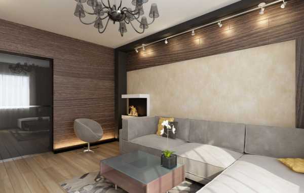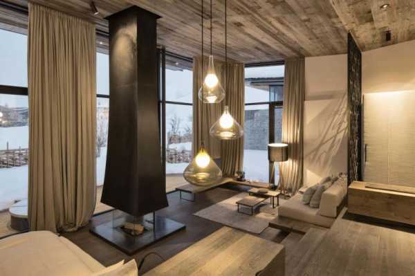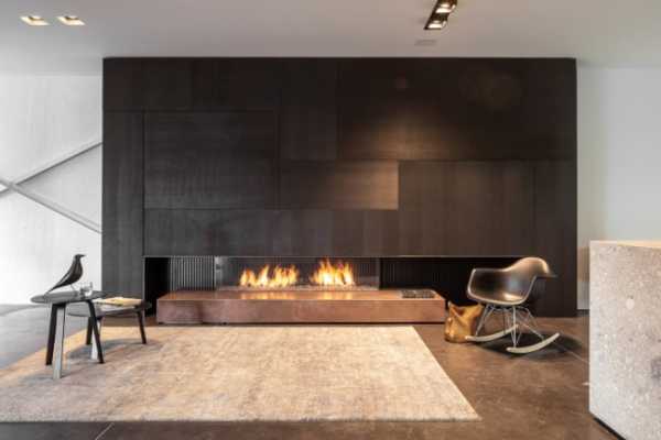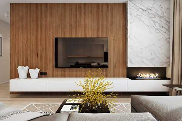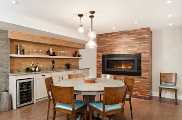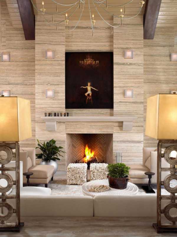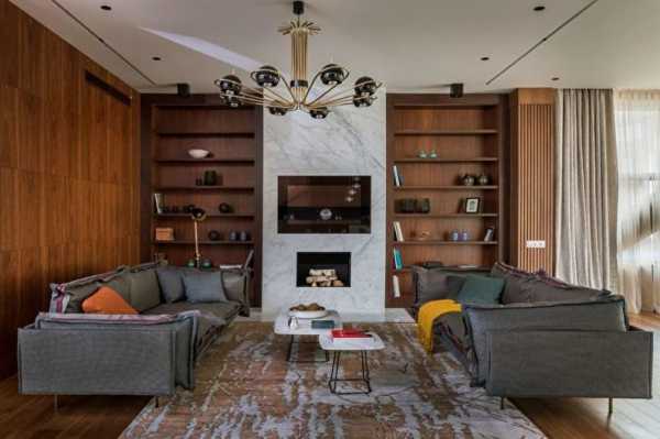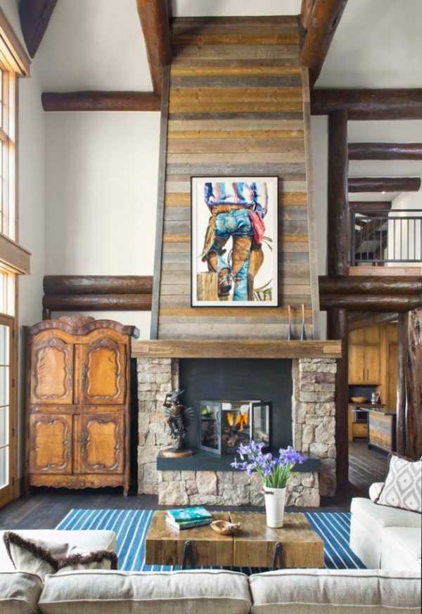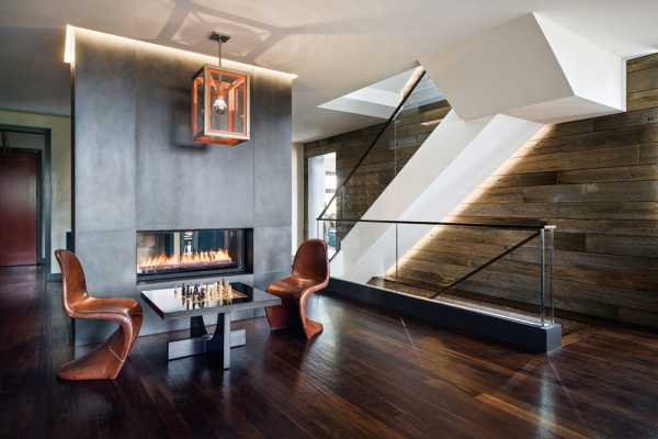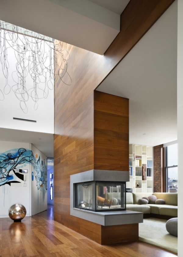 Отделка камина ламинатом разных цветов в двусветной гостиной