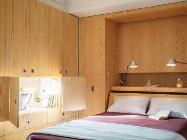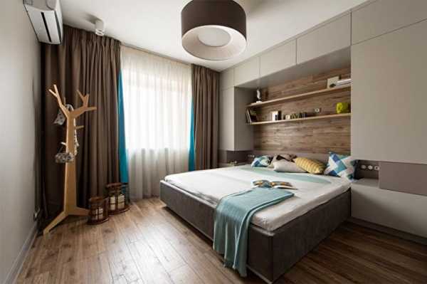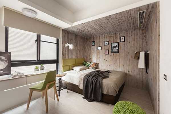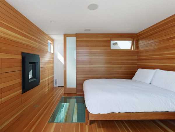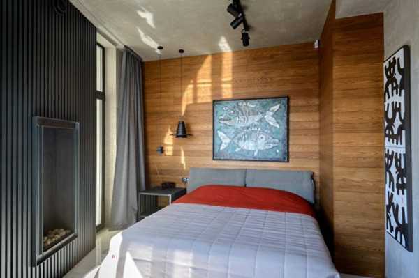 Стена и пол в спальне оформлены одинаковым ламинатом