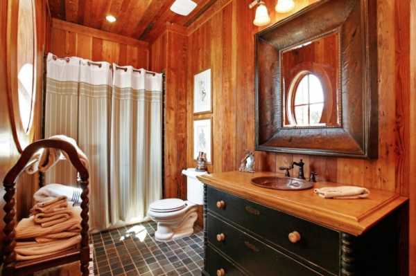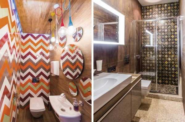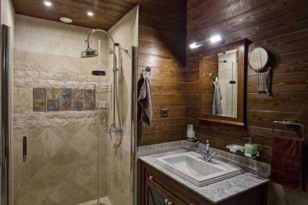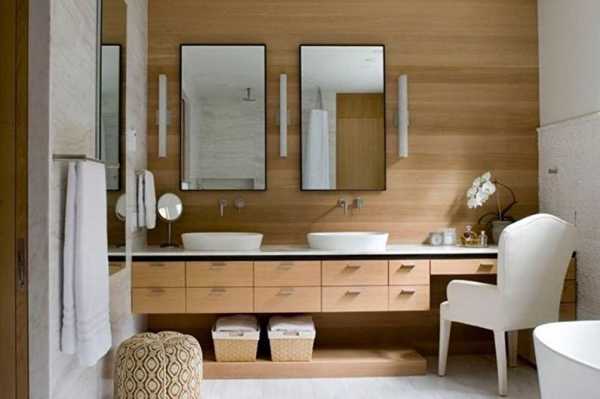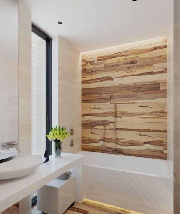Выделенная отделкой ламинатом короткая стена в ванной. Но учитывайте, что даже влагостойкий ламинат не подходит для душевой зоны!