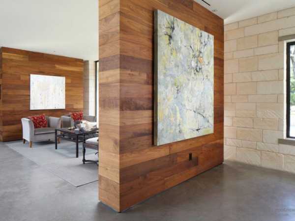 - Покрытие ламинатом целой стены или перегородки. Этот способ идеален для людей, не любящих полумер: если уж использовать ламинат на стену, то покрывать ее панелями полностью. Такое покрытие идеально для стен в прихожей или спальне, в гостиной или кабинете – каждой комнате с помощью этого материала можно добавить натуральности и теплого уюта.