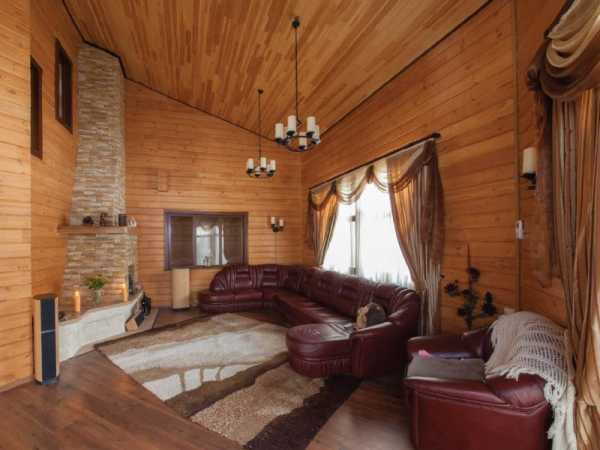 Горизонтальное расположение ламината, имитирующего лакированную сосну, на стене загородного дома