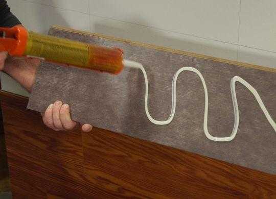 Клей наносится на панель с тыльной стороны. После клей наносят на торец панели, и так ламель за ламелью производится укладка.