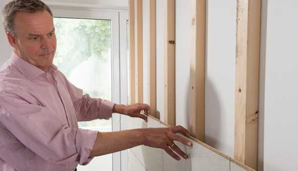 - сооружается вначале обрешетка. Для этого каждый брусок крепят к стене на дюбеля с саморезами. Крепление производят строго по уровню, так как даже незначительное отклонение от него повлечет деформацию и испортит внешний вид стены;