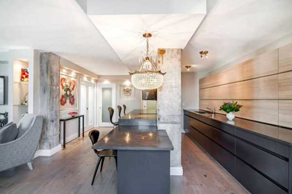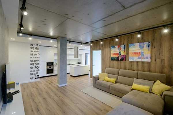 Отдельно стоящая колонна, обшитая ламинатом отлично вписалась в современный интерьер