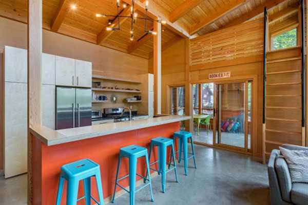 Темная ламинатная доска на полу в сочетании с яркими и цветными тонами