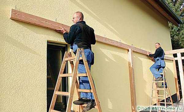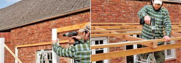 Навесы, пристроенные к дому, можно сделать своими руками. Фото отображает основные этапы монтажа. Каркас сооружения часто выполняется из профилированной трубы или бруса. Подобная конструкция примыкает к стене и принимает на себя нагрузку от скопившегося на крыше снега.