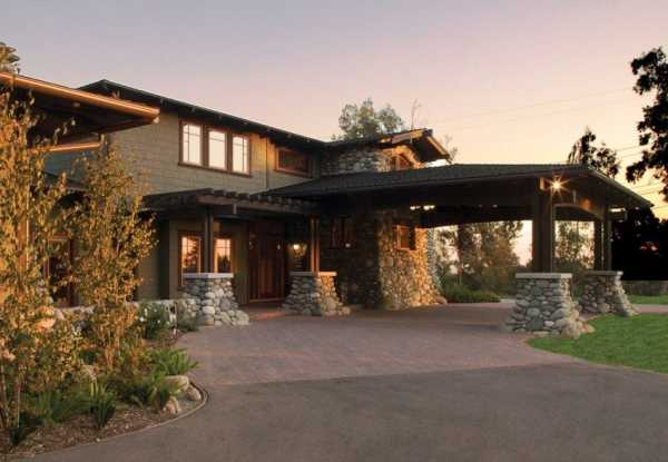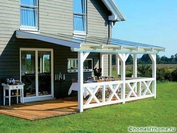 Важной частью экстерьера загородного дома является навес. Он призван защищать часть двора от осадков и ультрафиолетовых лучей, а также выполняет декоративную функцию. Небольшой участок, закрытый сверху материалом, представляют собой навесы пристроенные к дому. Фото подобных сооружений можно увидеть в данном обзоре. При этом опоры конструкции выводятся на нужную высоту. Присоединение к основному строению подразумевает крепление одной стороны конструкции к стене дома.