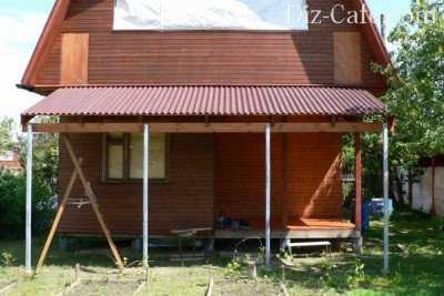 Навесы пристроенные к дому, как показано на фото, могут быть двух видов. Это консольные модели и навесы на опорах. Консольный вариант может быть любой длины, но его ширина не должна быть более двух метров. Опорные конструкции могут использоваться для различных целей.