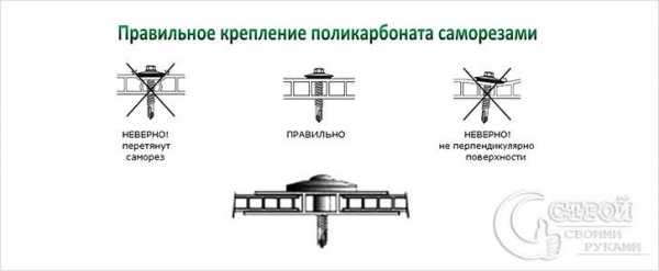 Листы кровельного материала нарезаются по размеру. Затем крепятся к обрешетке. Предварительно в поликарбонате проделываются отверстия под саморезы.
