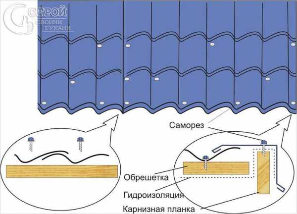 В качестве балок могут использоваться брусья из древесины. С течением времени в материале могут появиться трещины, которые снизят жесткость конструкции. После монтажа балок устанавливаются поперечные доски, а затем производится крепление металлочерепицы. Монтаж данного материала производится с нижних листов. Стоит учитывать, что должен быть нахлест верхних листов на нижние.