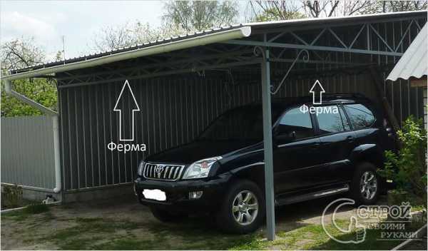 Полезный совет! Машина с грузом наверху должна свободно заезжать под навес. Но если высота кровли превышает 230 см, на автомобиль неизбежно будут попадать осадки. Выход есть — надо изменить угол наклона крыши.
