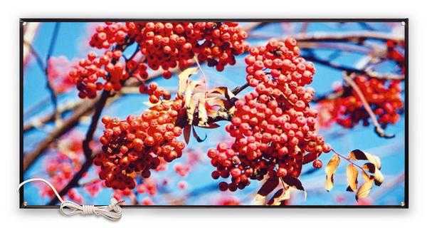 Несмотря на все достоинства обогревателя, основным его плюсом является его внешний вид. Обогреватель изготовлен из пленки с фотопечатью, и вы легко сможете выбрать подходящее изображение. Пленка закреплена с помощью двух деревянных планок, с крючком для крепления сверху. Панно практически не занимает места, толщина составит всего 3 см, при этом картина размером 100х50 см будет отчетлива, видна на стене. При необходимости даже пожилой человек справиться с монтажом обогревателя, ведь его вес составляет всего 650 грамм. Если вы захотите убрать панно или забрать его с собой с дачи, достаточно просто снять его со стены и свернуть как коврик.