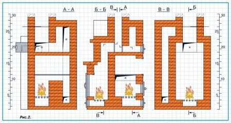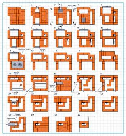 - С 22 ряда начинается кладка дымохода: дымовые каналы сужаются и постепенно перекрываются. Кладку ведут по схеме с 22 по 26 ряд, в котором устанавливают общую задвижку на каркасе из стального уголка.