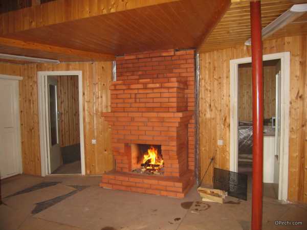 Открытый камин в центре помещения- Полуоткрытый — аналог закрытого вида каминов, его пристраивают рядом со стеной без сооружения в ней ниши. При этом дымоход поднимается вверх вдоль стены.