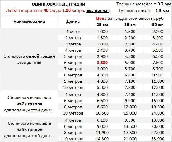 | Длина грядки, м | Ширина грядки, м | Оцинкованные грядки | Оцинкованные грядки с полимерным покрытием | |||
