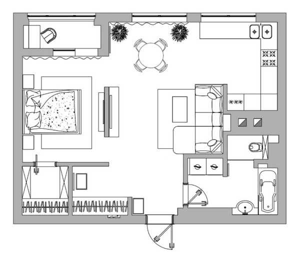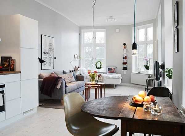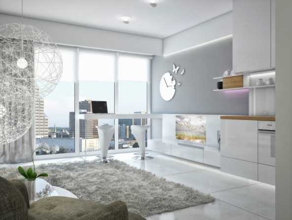 Основная особенность в планировке такого жилища в необходимости одно помещение обустроить и кухней, и многофункциональной гостиной комнатой. И поверьте, это совсем не трудно. На самом деле было бы все гораздо тяжелее, если у Вас была отдельная, но крохотная кухня. Здесь же Вы можете все организовать именно так, как Вам захочется и понравится, а что может быть прекрасней этого?!