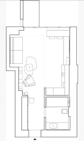 Квартира разделена на 3 области: холл, общая комната, которая исполняет роль кухни, столовой, кабинета, спальни, гостиной и санузел.