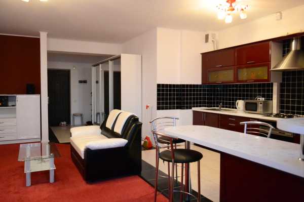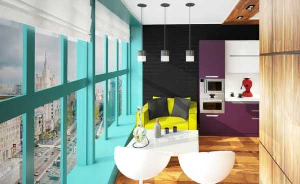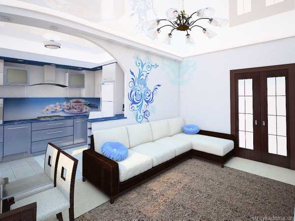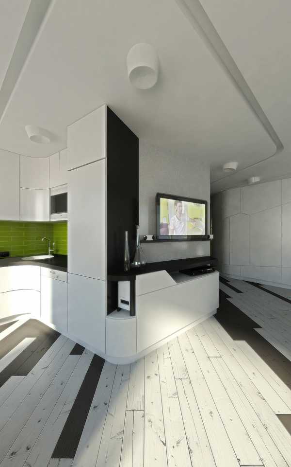 Помещение кухни (зоны для готовки) можно оформить практически незаметной, основная функция, которую она будет «выполнять» — это место для приготовления еды. Мебель выбирайте компактных размеров, нейтральной расцветки, которая будет сливаться с полом и стенами. Здесь главный акцент нужно сделать на зал Вашей квартиры студии. Повесьте большую плазму, установите диван-трансформер (его можно использовать в качестве перегородки между двумя частями квартиры) и небольшой стол. Здесь уже нужно применять яркие краски, можно даже рисунки.