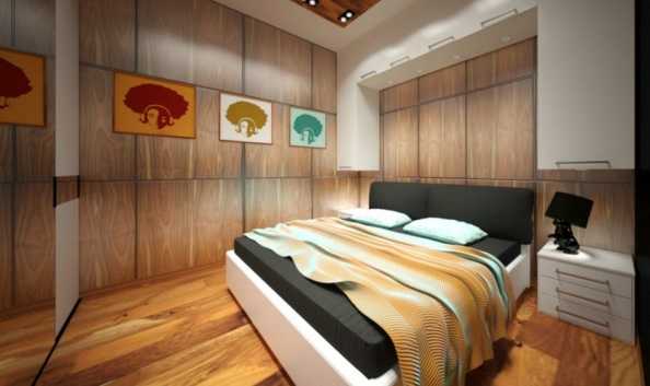 Не стоит заставлять небольшое помещение комодами, тумбами и прочим. В данном случае прекрасным вариантом будет встроенный шкаф и суперстильный книжный стеллаж. Если у Вас стены и потолок сделаны однотонными, только в таком случае можно использовать мебель разных цветов.