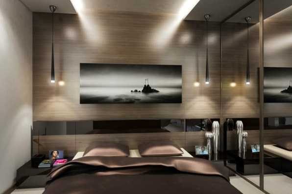 Дизайн области сна впечатляет прекрасными шоколадными тонами и зеркальными дверцами шкафа. Трюк визуально увеличивает пространство. Свисающие светильники в дуэте с завораживающей картиной сливаются в каком-то изумительном танце и воссоздают расслабляющую атмосферу. Дизайн спальни умиротворяющий и гармоничный. В зоне сна ясно прослеживается мужской характер.