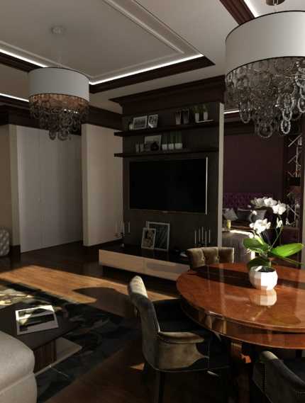 Гостиная отделена от кухни перегородкой с зеркальным экраном, что придает комнате объемов. В зоне отдыха царственно восседает мягкий диван. Круглый стол в объятиях кресел с бархатной обивкой выдает принадлежность к новой классике. Изумительные люстры с ниспадающими завитками и фигурками идеально дополняют красоту гостиной, подчеркивая элегантность, грациозность интерьера. На стене, отделяющей спальню от гостиной, гармонично смотрится телевизор. Комната очаровывает и манит комфортом и благородством.