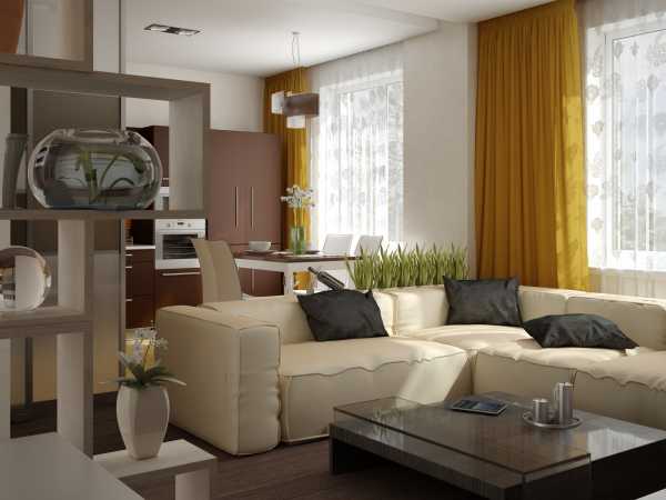 Вариант первый: кухня-столовая-зал плюс спальня. Наиболее оптимальный вариант для молодой семьи, состоящей из двух человек. Суть дизайна: совместить кухню и зал, а в самом зале расположить место под обеденный стол. Спальню (кровать) можно оградить конструкцией из гипсокартонных листов, полкой, шторами, гардинами.
