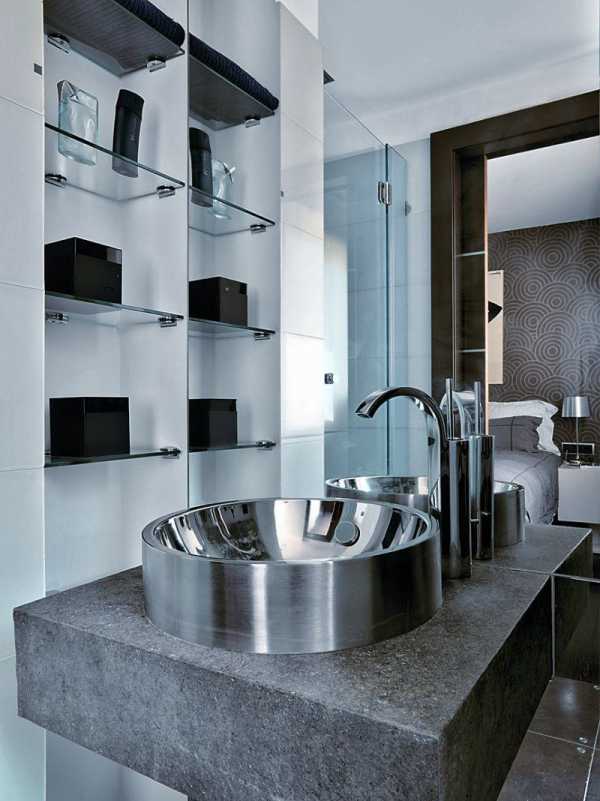 Ванная комната, кажется, неимоверно огромной, благодаря душевой кабине со стеклянными дверцами, ультрасовременной сантехнике и цветовой гамме. Помещение завораживает эксклюзивностью и объемами.