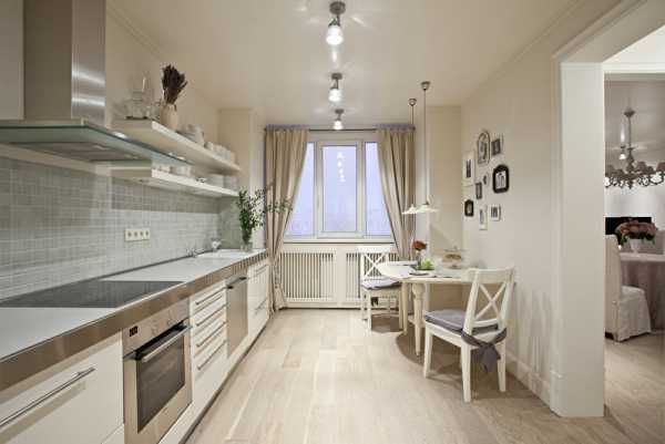 При такой планировке предпочтительнее повесить шторы с крупным рисунком. Следует продумать дополнительное освещение. Обычно оно устанавливается на фартук. Двери выбираются раздвижного типа, чтобы сэкономить место.