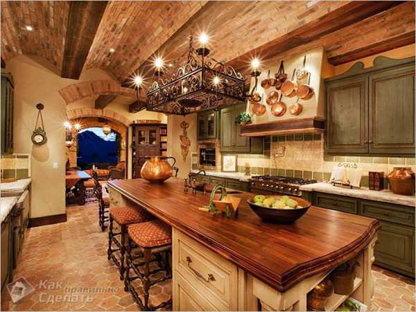 Деревенская классика в дизайне данного помещения актуальна на протяжении нескольких десятилетий. Этот стиль хорош и для кухни загородного дома, и может быть запросто воплощен в отделке кухни квартиры, расположенной в мегаполисе.
