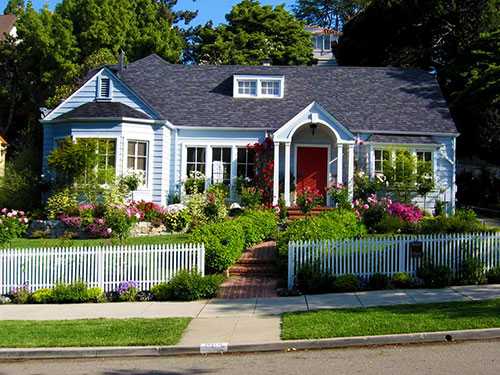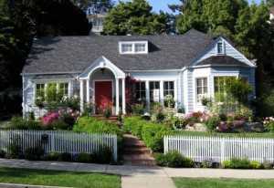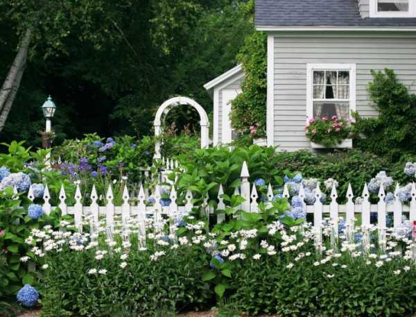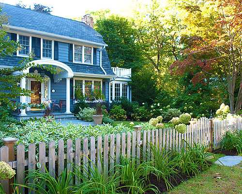 Ну и последнее, это декоративная отделка дома и ограждения. Что бы дом сочетался с оформленным палисадником, необходимо украсить фасад вьющимися растениями, такими как: девичий виноград, плетистая роза и плющ. Что касается заборчика, он, как и во всех остальных случаях должен быть небольшой высоты, только окрашенный в белый цвет (для лучшего сочетания) и не должен иметь острых верхушек.