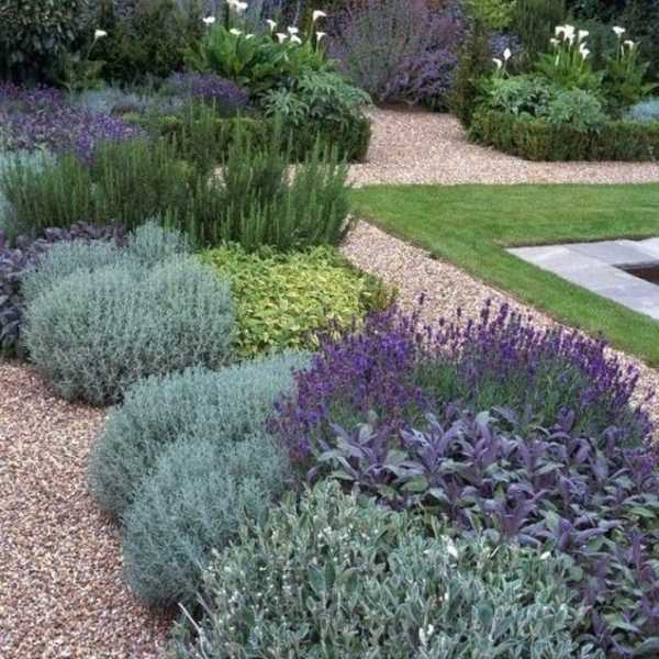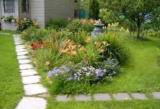На большом участке используют низкие плотные посадки, растущие по бокам тропинки.