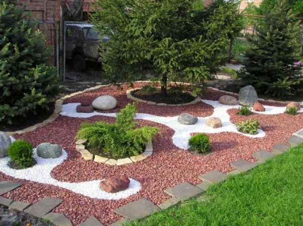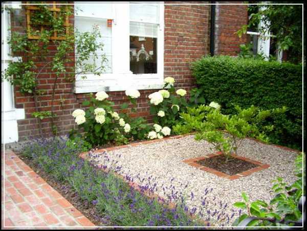 Если один ярус растений будет приподнят над другими на 20-30 см, то это тоже сделает палисадник более интересным. К примеру, можно оформить перепады высоты так, как на фото — с помощью гальки и декоративного кирпича.