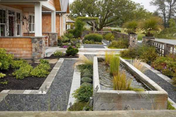 Вода в небольших ёмкостях, гравийное обрамление, элементы керамики придадут индивидуальности придомовой лужайке.