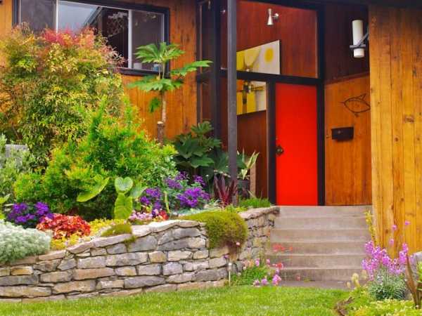 Сначала нужно рассмотреть входное пространство. К двери прокладывают широкую прямую или узкую изогнутую дорожку, вдоль которой идут по обе стороны цветники. Содержимое этих клумб определяется в соответствии с типом дома: для лаконичного, сдержанного архитектурного строения подойдёт ярко-красочная клумба, а для здания с излишними декорациями – со скромным цветником.