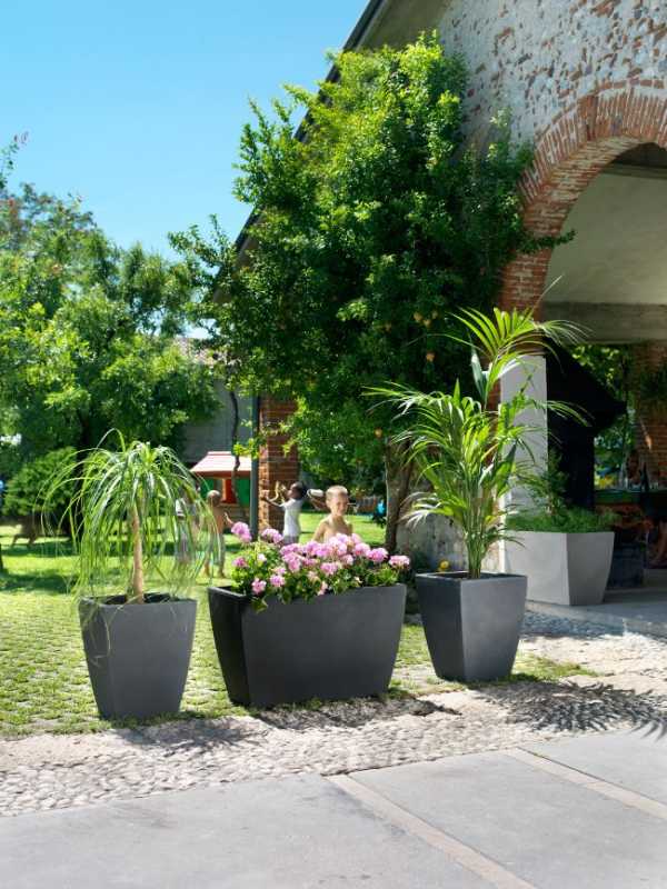 Одним из самых лёгких способов сделать красивый палисадник возле дома оформить его кадками с растениями, обрамлённые галькой или гравием. Ещё для приподнятия растений используют пни или камни, чтобы выделить из всей композиции.