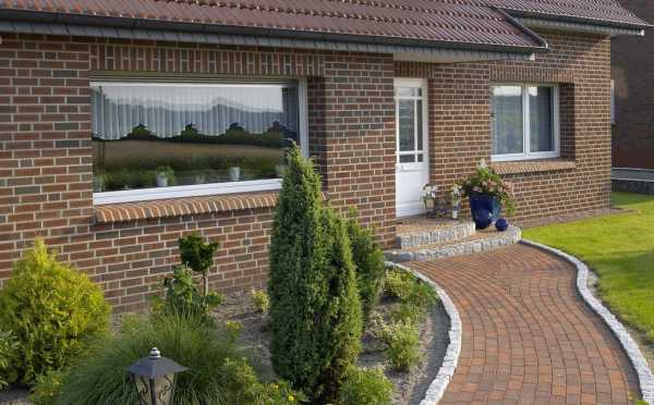 С кирпичными стенами дома будет хорошо гармонировать садовая дорожка, выложенная клинкерным кирпичом. Можно посадить цветы под цвет, в который выкрашены наружные стены дома, можно украсить палисадник корягами подходящими по стилю под бревенчатые стены и т.д.
