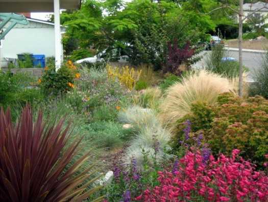 Вот один из примеров цветников в палисаднике, который можно отнести к классическому стилю, используя злаковые и красивоцветущие растения.