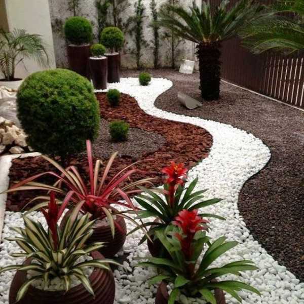 Один из простых приемов украшения палисадника — выставить красивые растения в кадках, выделив их засыпкой из декоративного гравия или гальки.